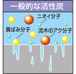 一般的な活性炭は表面が滑らかで、均等なサイズの穴しか開いていません。これではすぐに目詰まりが起きやすく、同じサイズの物質しか吸着できません。特に大きな分子を吸着する事は苦手です