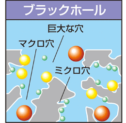 一方、ブラックホールは、大きな穴の中にさらに小さな穴が開いている複雑な構造になっている事がわかります。このため、大きな分子から小さな分子まで幅広い大きさの物質を吸着できます。