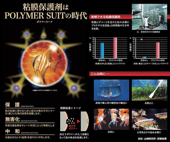 高分子ポリマーにより粘膜を保護粘膜にダメージを受けた魚に使用した場合、斃死率が低下する結果がキョーリン研究所の調べで明らかになりました。